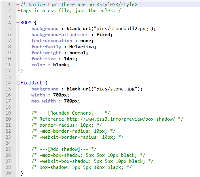 Next the 'body' object followed by the 'fieldset' objects are identified and given several declarations each.