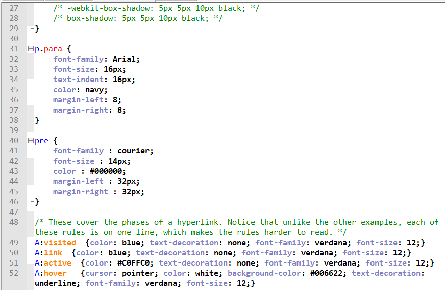 In this illustration, we see the top of an external file containing CSS declarations. Note that the first 2 lines (in green) are comments. A CSS comment starts with '/*', then continues until the end delimiter is found which is '*/', the inverse of the start delimiter. These can run for one line, a portion of a line, or several lines.