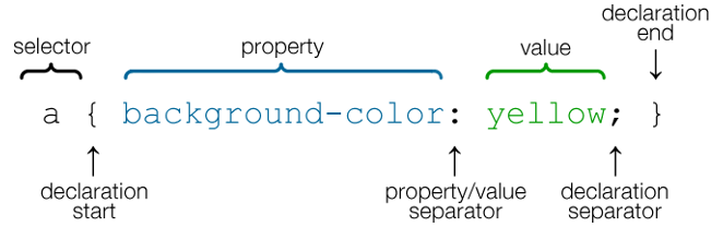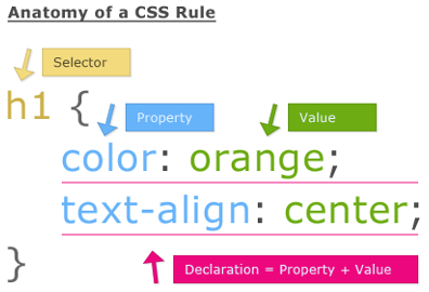Below you can see that the object type is first (in this case 'h1') and all of the declarations for that object type are enclosed in curly brackets. Each declaration starts with the characteristic's name (in this case 'color') followed by a full colon'. Then the value you want assigned to that characteristic is listed followed by a semi-colon. That is followed by a second declaration that the 'text-align' characteristic should be assigned or set to the value 'center', and then that ends with a semi-colon. And finally, all of the encapsulated declarations are closed with the curly bracket. From that point on, every 'h1' object will be displayed in the color 'orange' and will be 'center justified'.