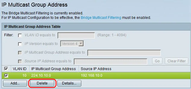 Step 2. (Optional) To delete an IP multicast group, check the check box of the IP multicast group and click Delete.