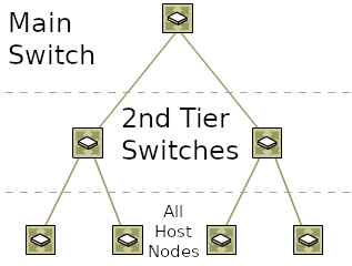 Initially, the approach was to place a large switch in the computer room and another in the Tech Booth, and on the third floor. All leaf-nodes would connect to those. This was beginning to exhaust ports on the computer room switch, but the others seldom expanded nor were expected to in any significant way.