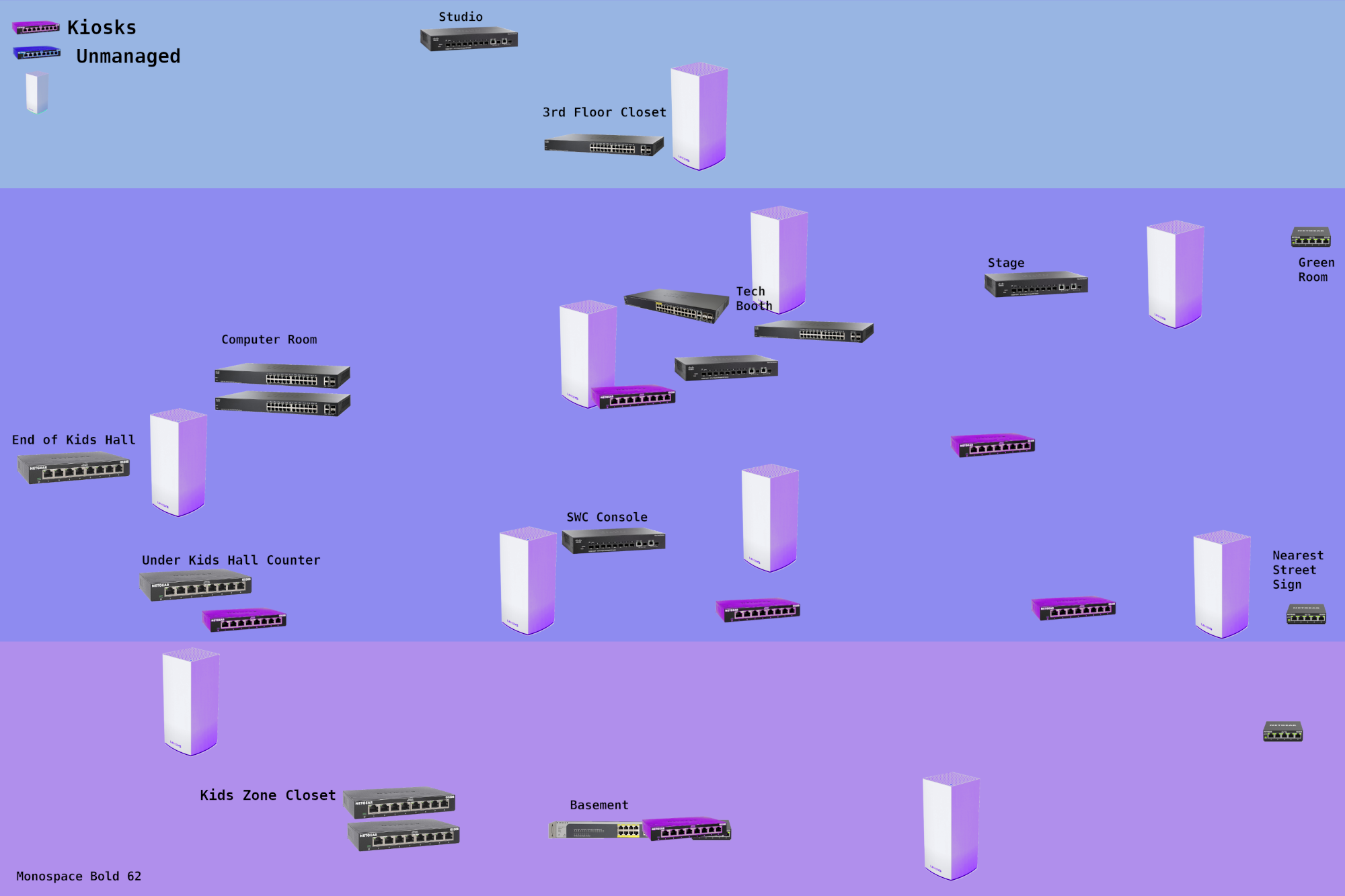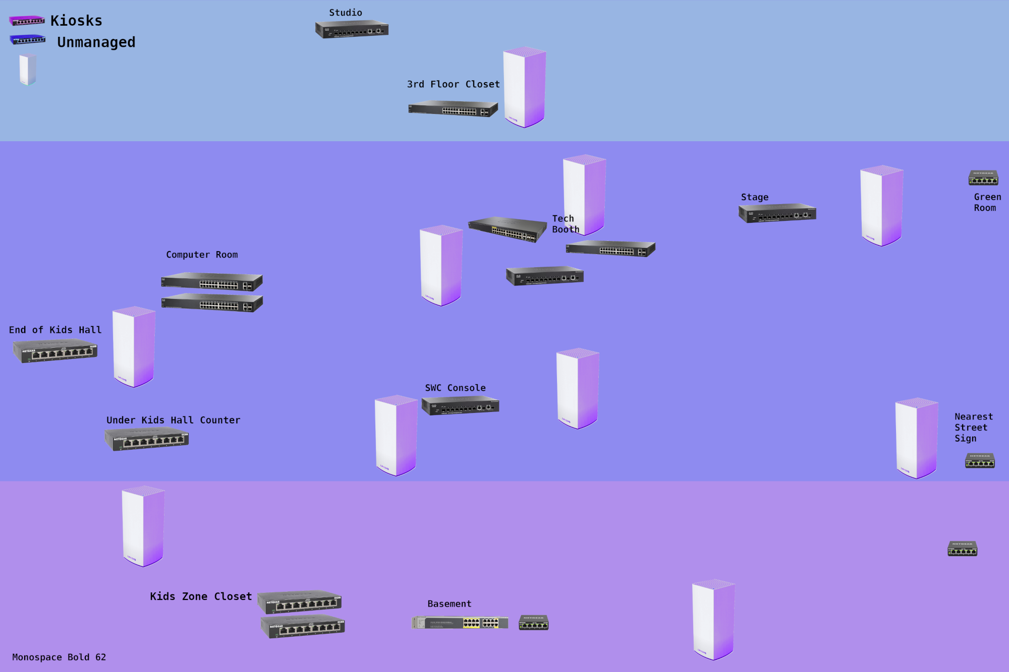 Note that there are several UnManaged switches in the LAN. These include those under the shelves for the Kiosks, the AP nearest the street sign, and several more. They are Netgear 5 port switches for the most part.